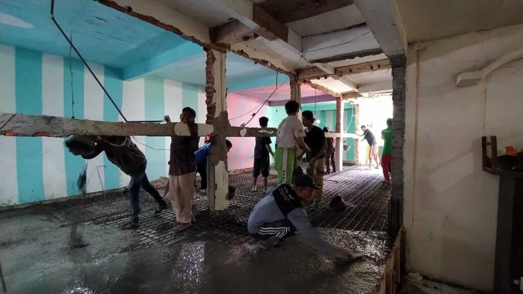 Peruntuhan lantai yang memakan waktu berhari hari ini dilanjutkan dengan pemasangan piranti lantai yang nantinya akan dicor pada hari ini pukul 07.00 WIB s/d selesai. Sungguh sebuah perjuangan yang panjang, mengingat membangun sebuah bangunan bukanlah hal yang mudah. Apalagi status santri yang merangkap menjadi mahasiswa dengan banyak tugas membuat mereka harus bekerja ekstra secara fisik dan pikiran agar keduanya berjalan seimbang.